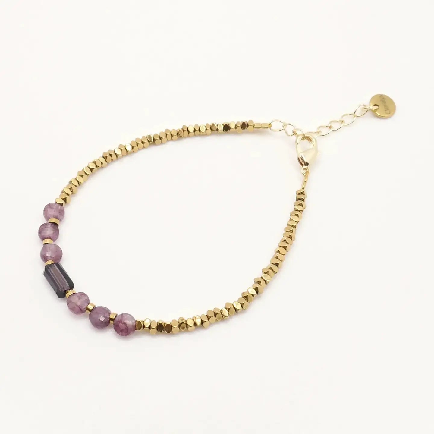 Composé de mini perles hexagonales en hématite dorée, de pierres roses poudrées en quartz d’Afrique et d’une perle tube centrale en cristal prune, il associe subtilité, éclat et symbolique.