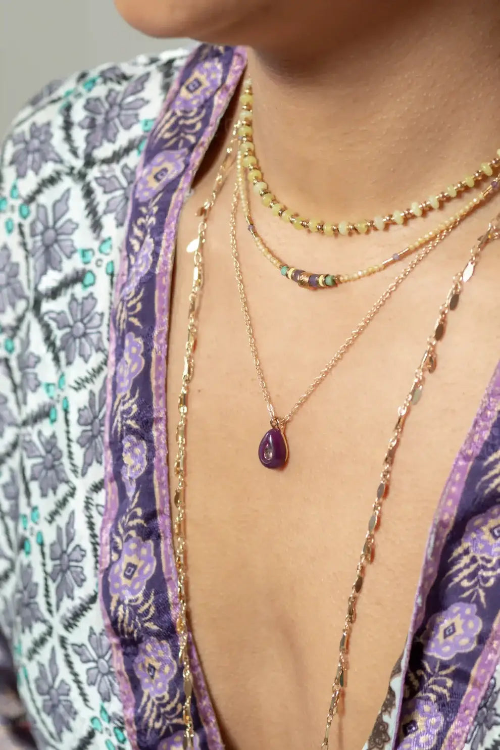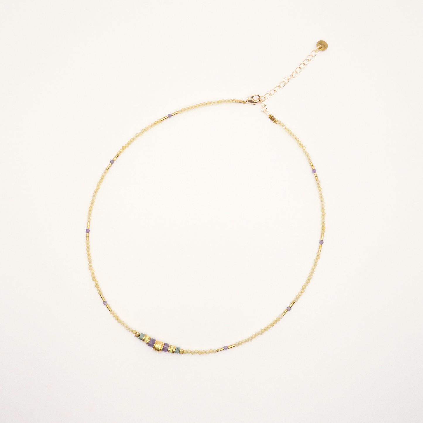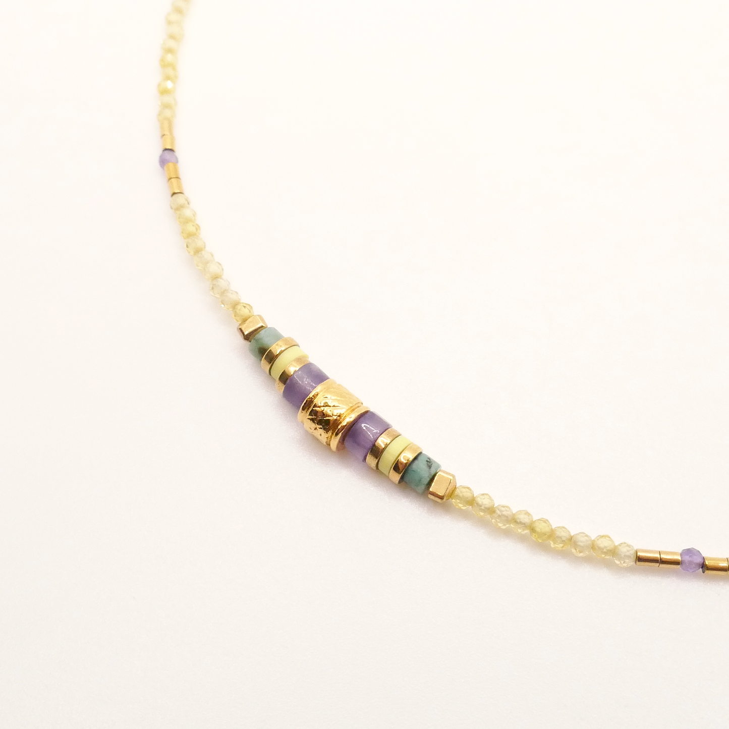 Composé de mini perles facettées en zircon jaune, d’améthyste et de turquoise d’Afrique, il se pare également de touches d’hématite gold et de perles heishi en polymère et améthyste.