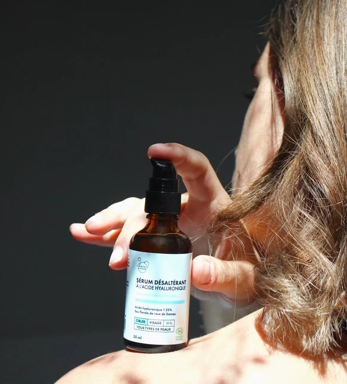 Imaginez votre peau abreuvée après une longue soif. Le Sérum désaltérant Clémence & Vivien agit comme une vague de fraîcheur qui vient hydrater intensément et redonner éclat et vitalité au visage. Sa formule à base d’acide hyaluronique, alliée à l’eau florale de rose de Damas, capte et retient l’eau au cœur de la peau, pour un teint rebondi, lumineux et apaisé.