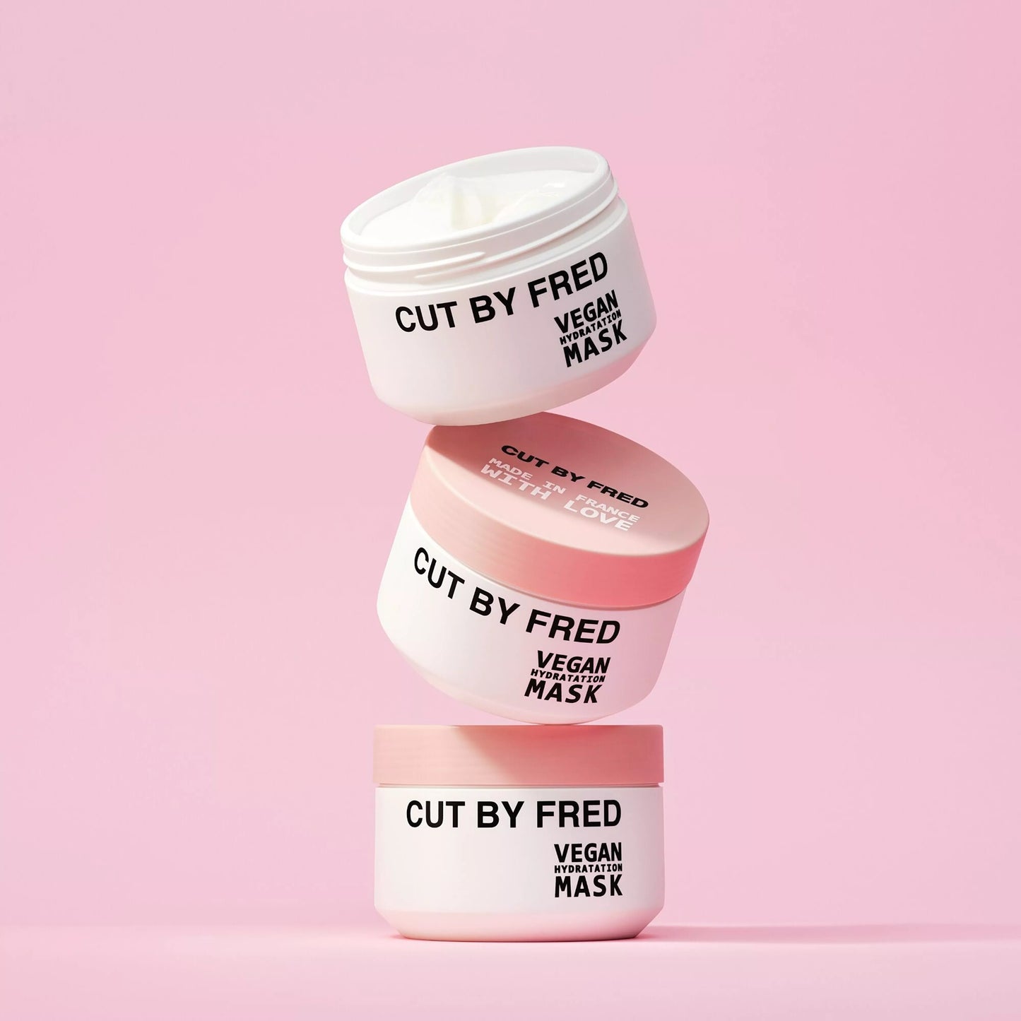 Trois pots Vegan Hydratation Mask Cut By Fred empilés sur fond rose, soins capillaires naturels.