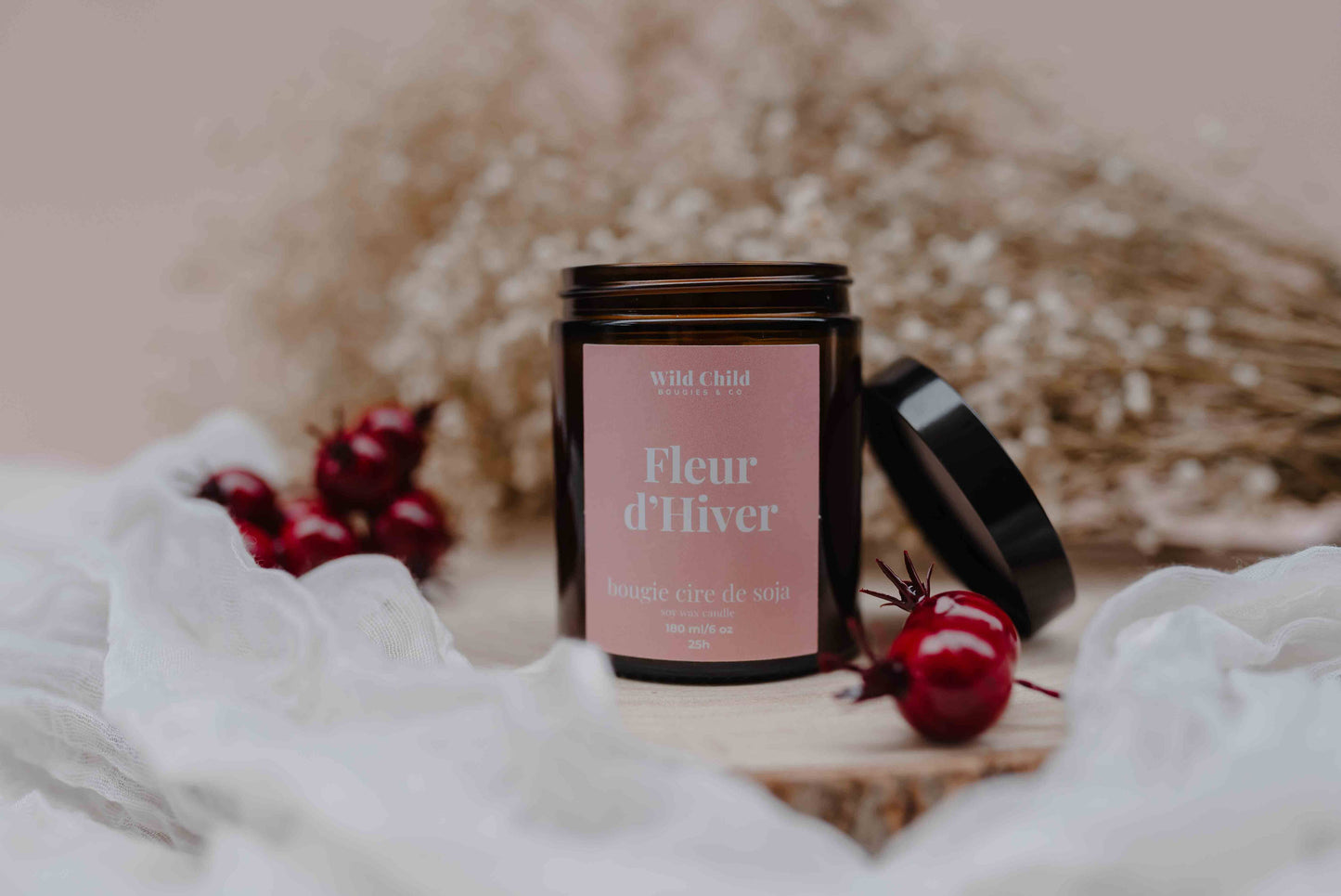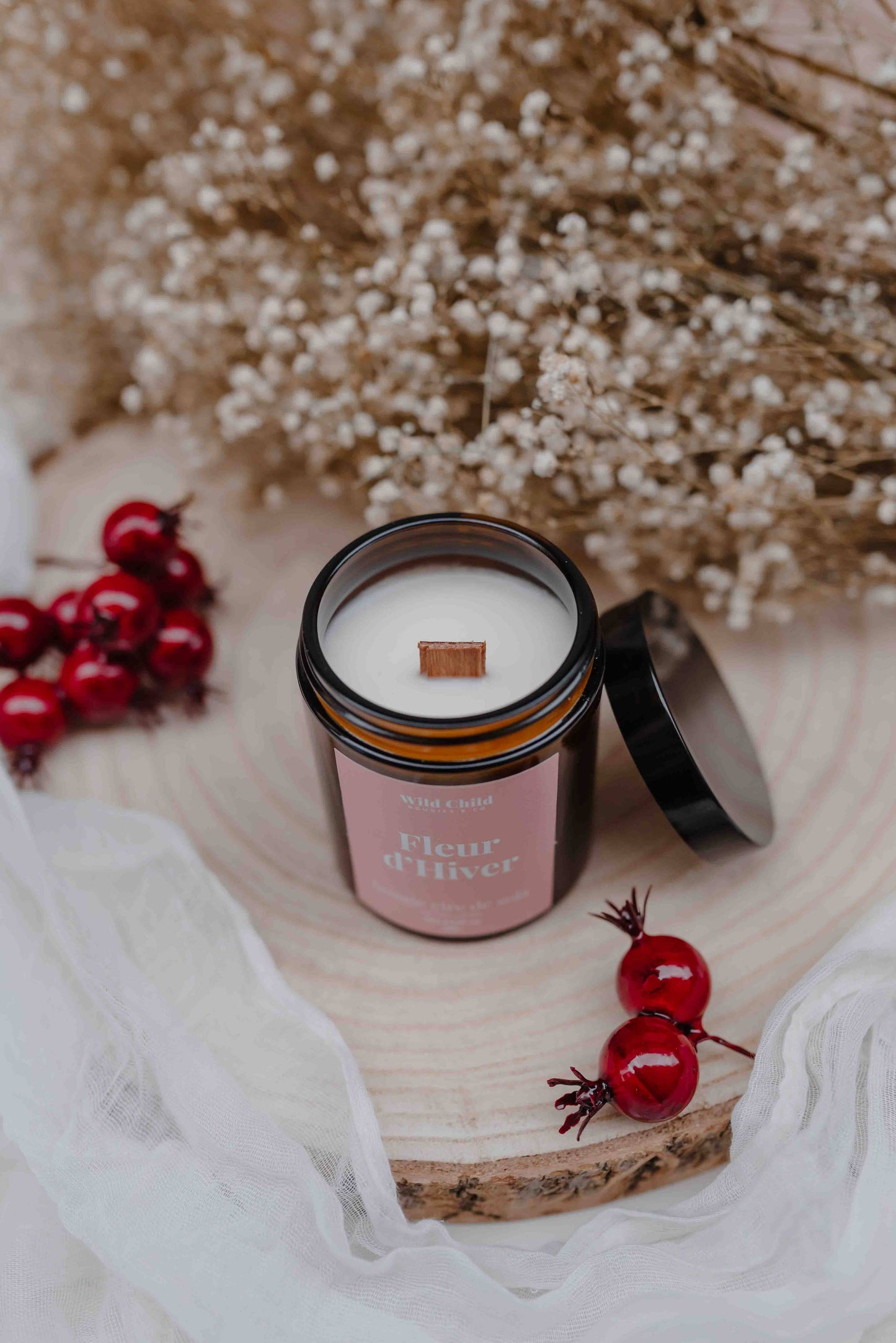 Bougie Fleur d’Hiver ouverte, cire blanche et mèche en bois visibles, décorée de baies rouges et gypsophile.