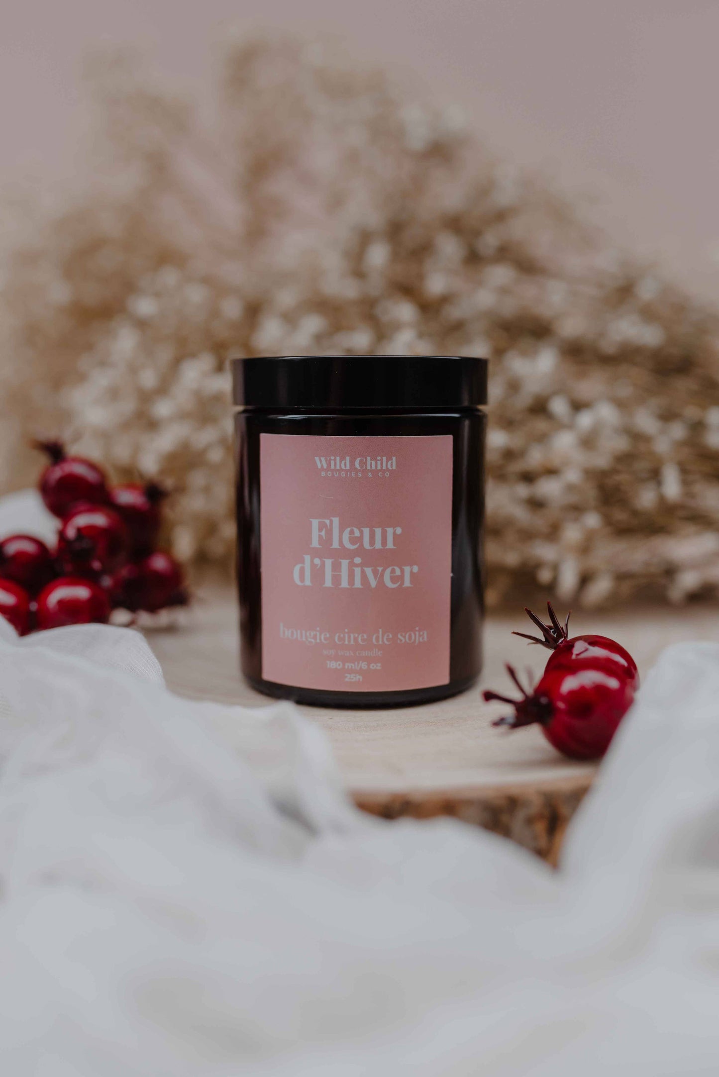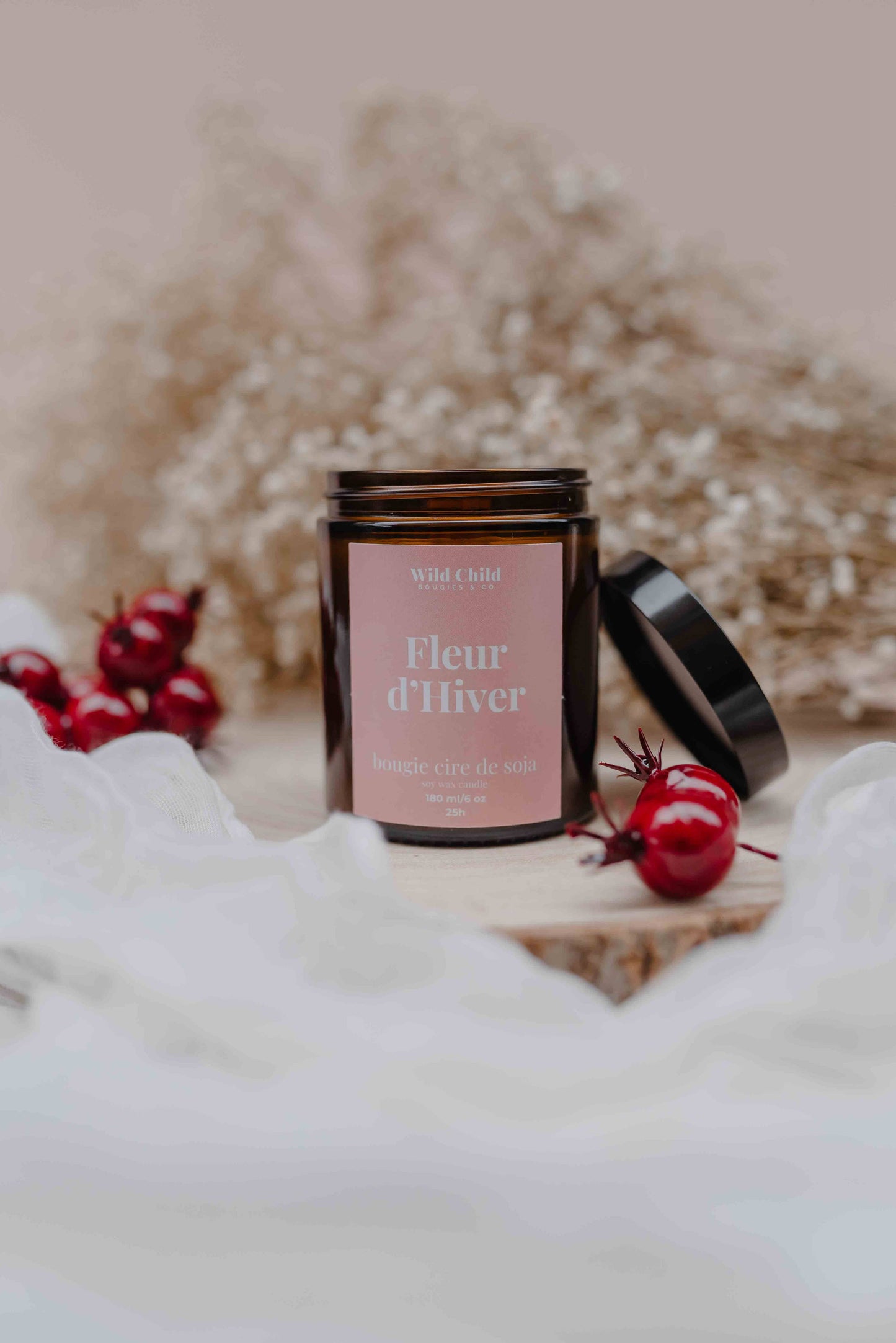 Bougie Fleur d’Hiver allumée, pot ambré posé sur un rondin de bois, décor hivernal doux avec baies rouges et gypsophile.