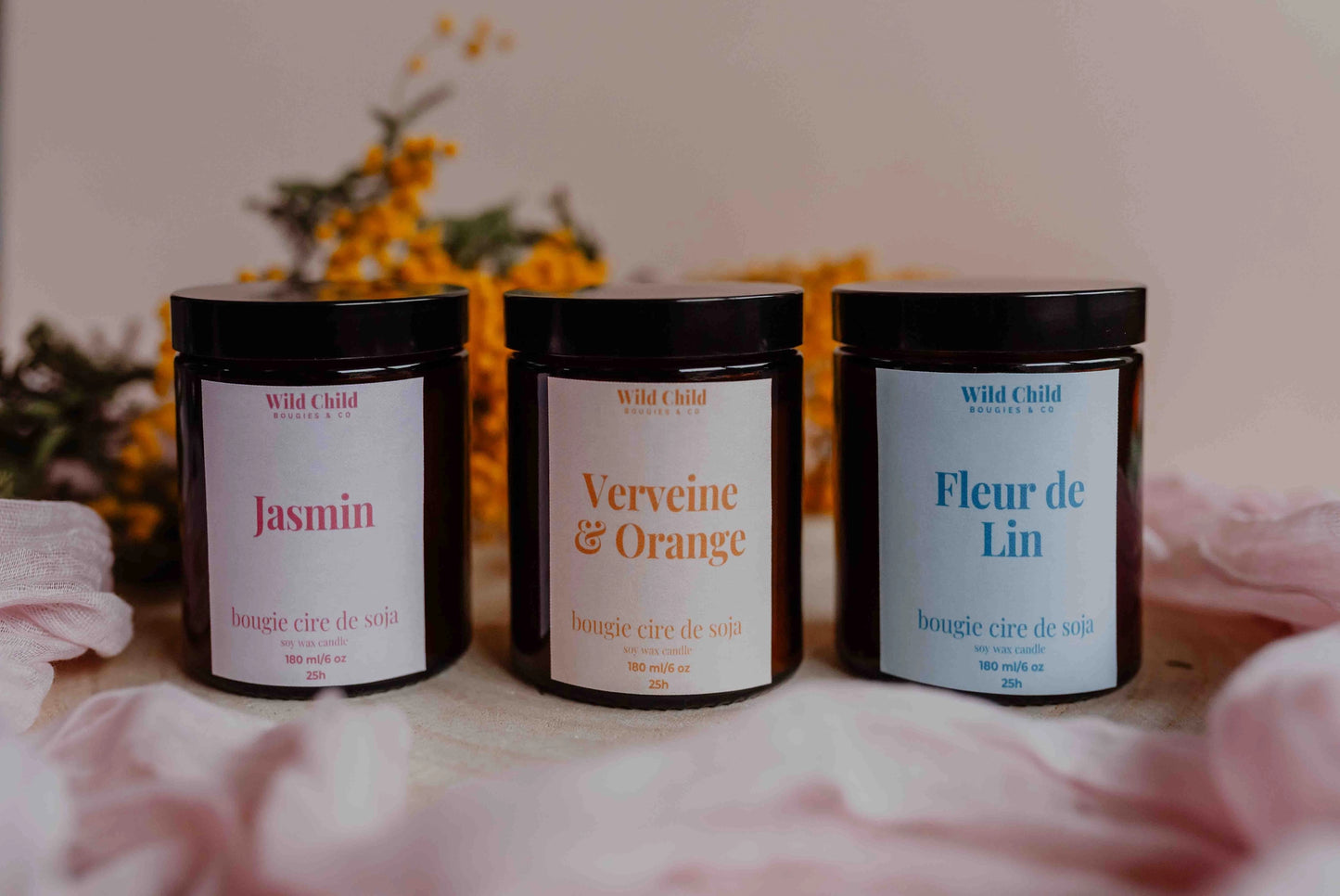 Chaque bougie est coulée en petite quantité, avec des matières premières choisies avec exigence : cire de soja 100% naturelle, parfums sans CMR, contenant recyclés ou recyclables.
