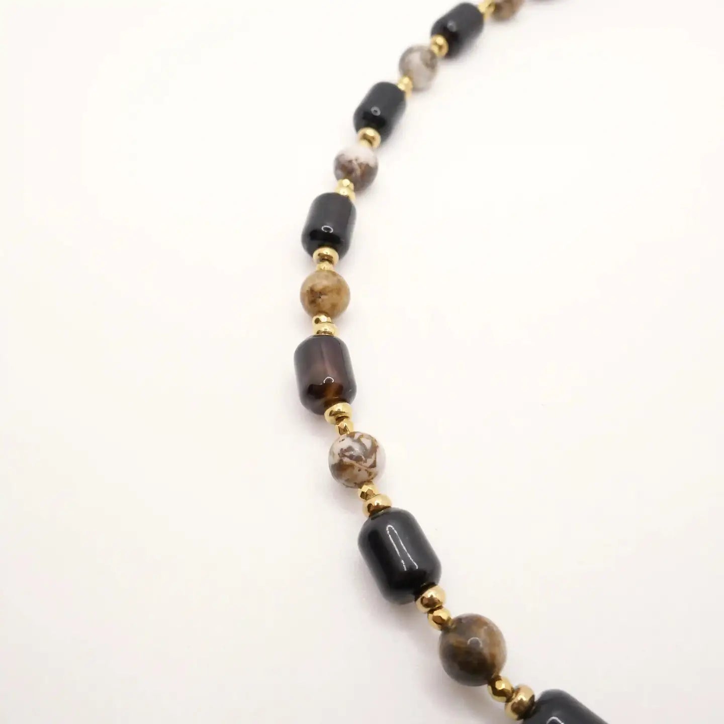 Composé de pierres rectangulaires d’Agate d’Afrique et de pierres rondes en Jaspe d’Afrique, il est sublimé par un assortiment raffiné de perles en Hématite gold.