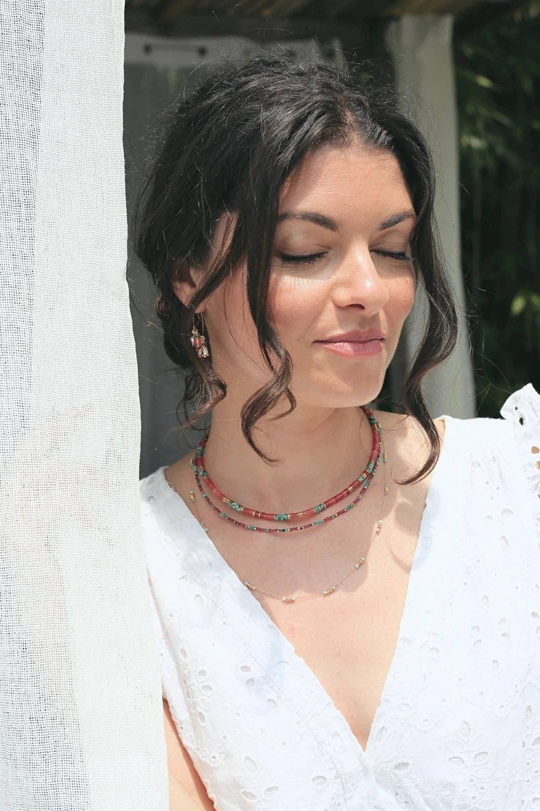 Il se compose de mini perles de cristal bordeaux, de turquoise d’Afrique et d’hématite gold, sublimées par un fermoir et une chaînette de rallonge dorés à l’or fin 24k.